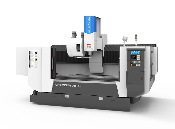 SD2550-BT40 is a large-scale profile processing center specially designed for customers; Sky track type mechanism; The motion mode is to move the Y-axis workbench forward and backward, the X-axis machine head moves left and right, and the Z-axis spindle moves up and down.